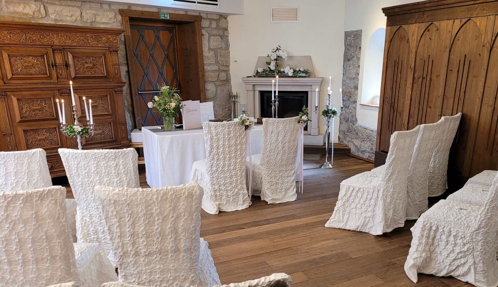 Das romantische Kaminzimmer befindet sich im Kapellenbau der gut erhaltenen und zeitgenössisch restaurierten Burganlage. Hier sind ganzjährig Trauungen mit bis zu 30 Personen möglich. Für eine höhere Personenzahl kann bei Bedarf auch der angrenzende Saal mitgenutzt werden.