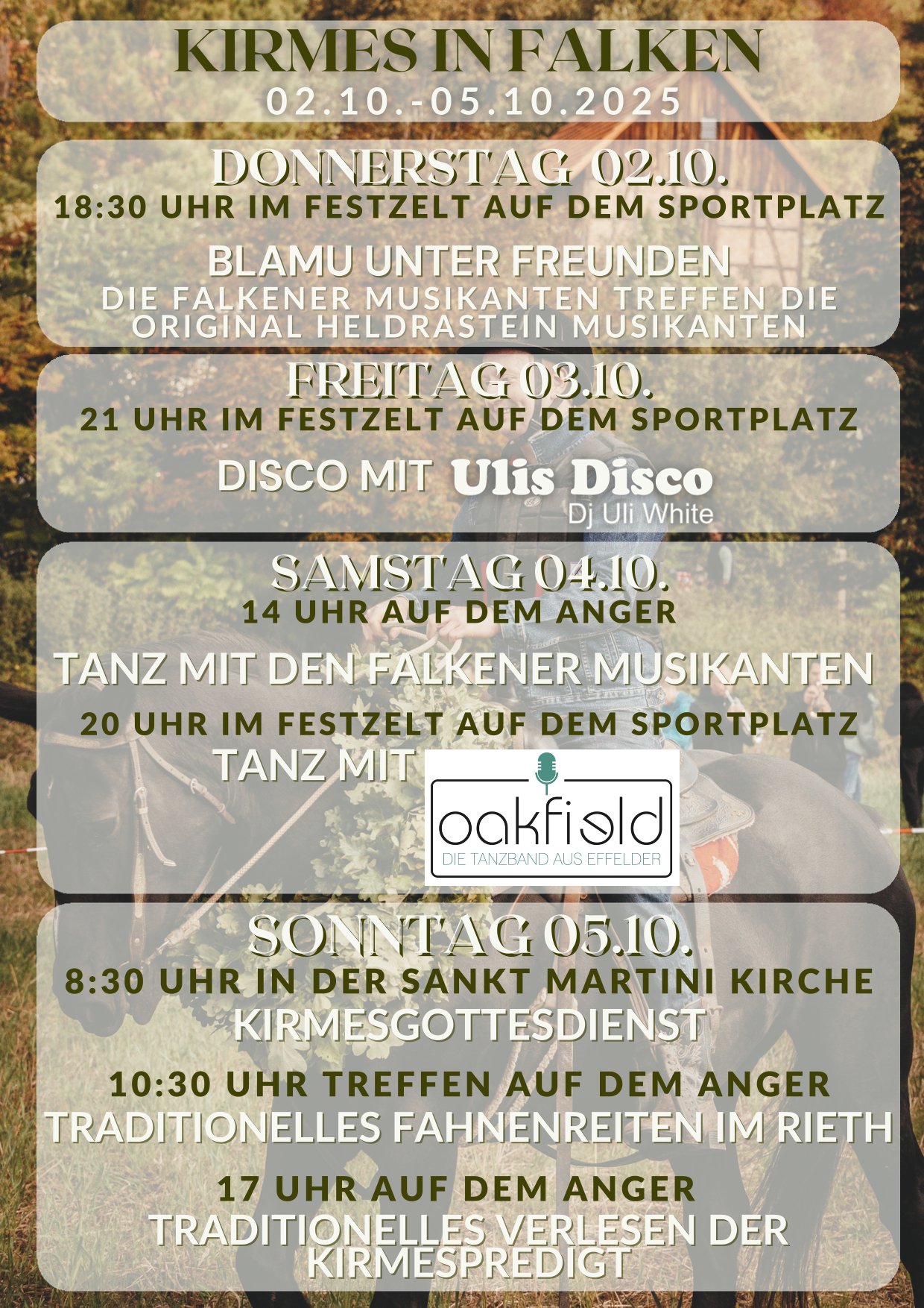 Abends geht es im Festzelt weiter, wo die Tanzband „Oakfield“ ab 20:00 Uhr für beste Unterhaltung und einen unvergesslichen Kirmesabend sorgen wird.