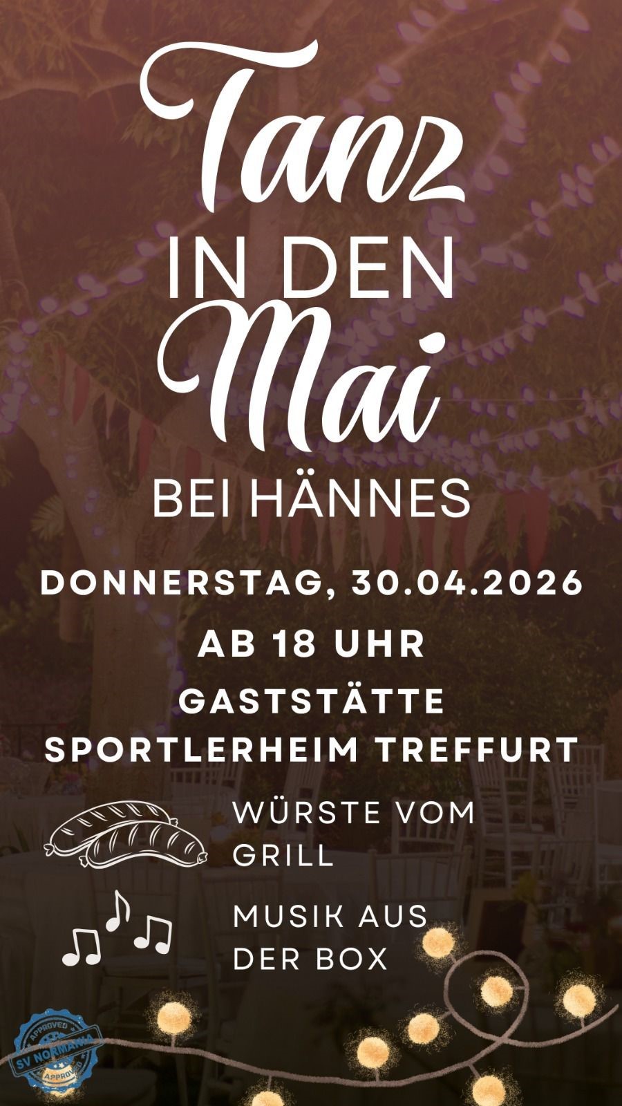 Am Donnerstag, den 30.04.2026, lädt der Sportverein ab 18 Uhr in die Gaststätte am Sportlerheim ein. Freut euch auf einen gemütlichen Abend mit Würstchen vom Grill, Musik aus der Box und guter Stimmung. Und wenn das Wetter mitspielt, wird natürlich draußen im kleinen Biergarten gefeiert. Lasst uns gemeinsam in den Mai starten. Wir freuen uns auf euch