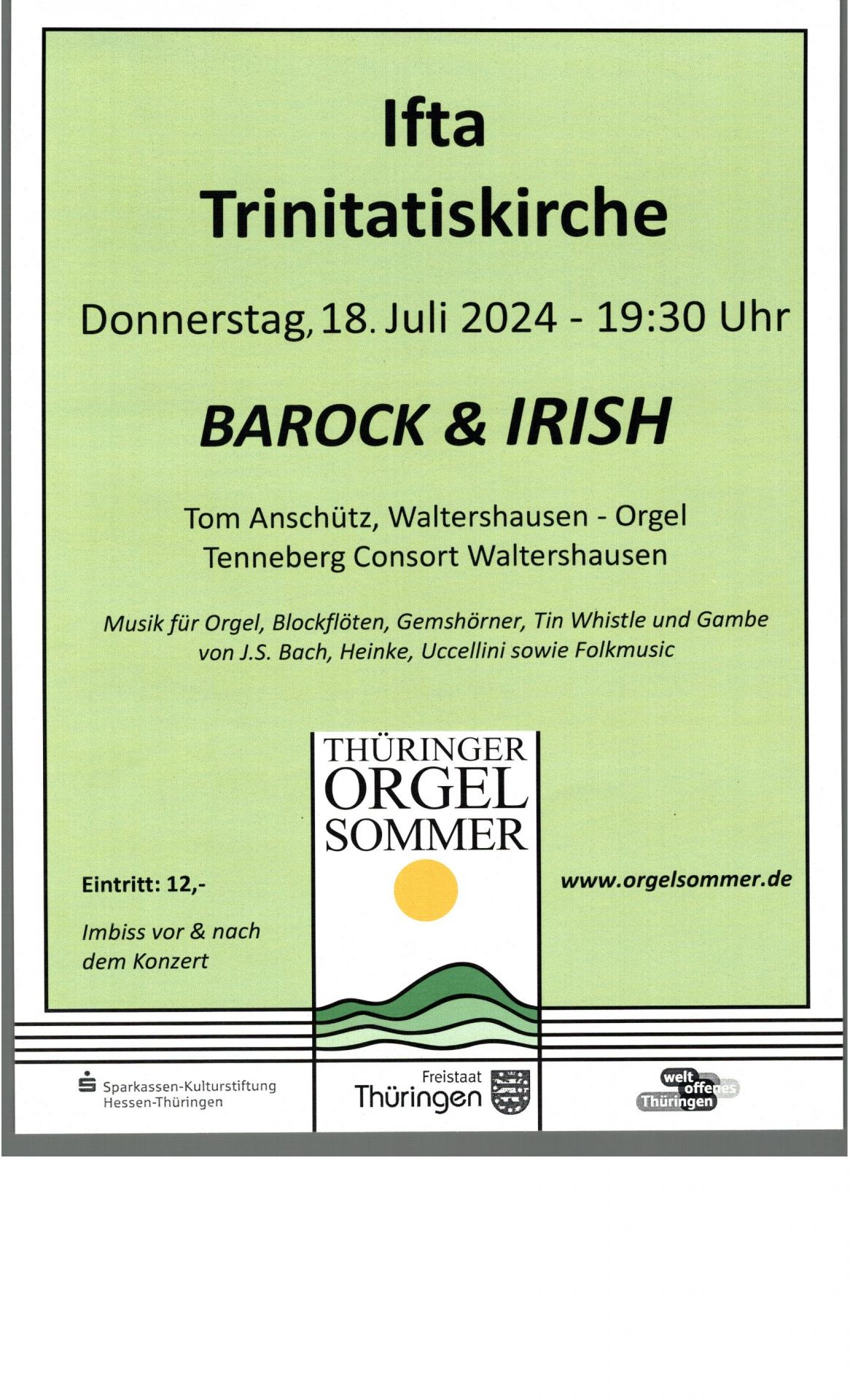 Der Thüringer Orgelsommer e.V. ist in diesem Jahr zu Gast mit dem Programm Barock [&] IRISH in der Trinitatiskirche Ifta.